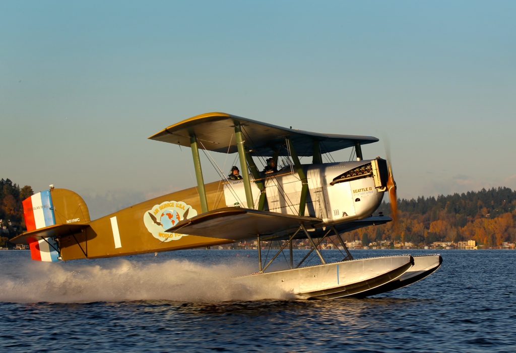 The history of the 1924 First World Flight: On 6 of April, four U.S. Air Service (Army) Douglas World Cruisers (DWC), named Seattle (command ship), Chicago, Boston, and New Orleans, departed Lake Washington, on floats, from Seattle’s Sand Point Field. The first audacious attempt to circle the globe became a successful journey that would take almost six months, over 27,000 miles, in open cockpit biplanes. At the conclusion (28 September 1924), two of the original aircraft returned, and the world had been conquered by air. It was, in fact, the second aviation milestone after the Wright Brothers.